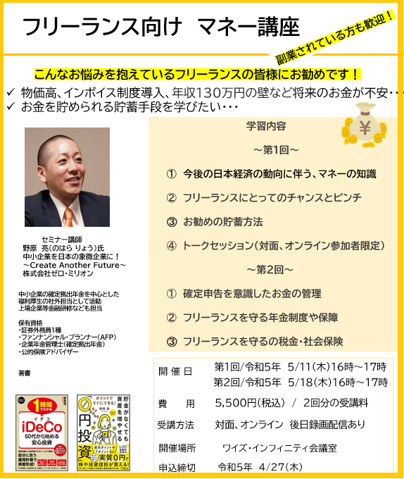 今回、第1回では日本経済の動向に伴うマネーの知識、フリーランスにとってのチャンスとピンチ、お勧めの貯蓄方法等、第2回では確定申告、年金、税金、社会保険等、フリーランスの方が見逃しがちな情報をお届けします。
