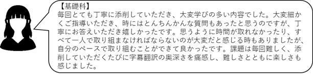 (ワイズスタッフ)実際に課題をやってみると、字数制限に収める難しさや字幕の翻訳の奥深さを実感しますよね。基礎科で学んだことをしっかり定着させて、次のコースでも頑張ってください!