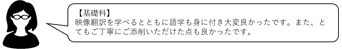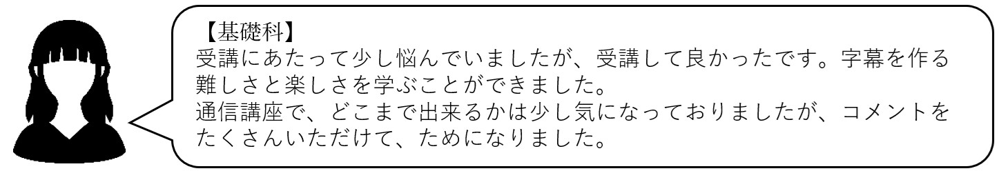 (ワイズスタッフ)基礎科では確実に字幕ルールを身に付けるという段階的なカリキュラムを採用していますので、自分のペースでしっかりと学習できたようでよかったです!通信講座は一人で学習を進めるため不安になることもあるかと思います。そんな時はぜひスクールに相談してくださいね。