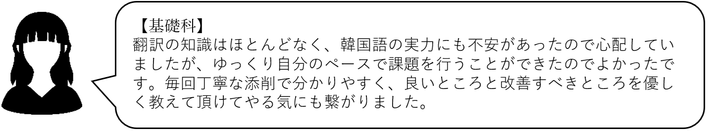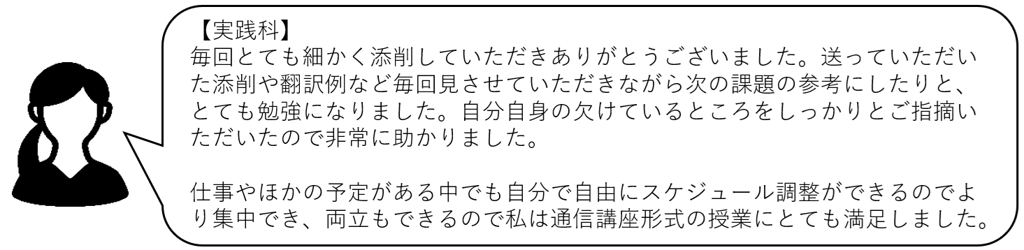 (ワイズスタッフ)基礎科と実践科、それぞれの声をアップしました。基礎科では、字幕ルールをじっくり丁寧に学んでいただき、実践科では様々な素材を扱って、表現力や翻訳スピードなどを磨いていただくカリキュラムになっており、それぞれの楽しさや難しさがあるかと思います。講師の添削がモチベーションになっていたとお伺いでき、とてもうれしく思っています。