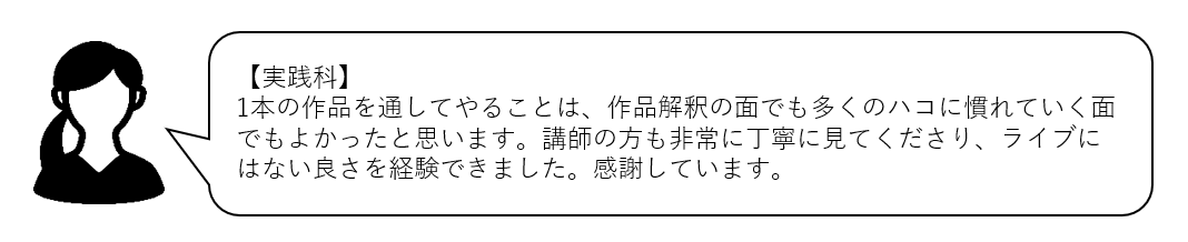 (ワイズスタッフ)講座を通じて楽しさを実感していただけて良かったです。実践科では映画を丸ごと1本翻訳していただくのですが、作品のテーマを理解することや、キャラを深掘りすること、何をどのタイミングで訳出するなど、多くの学びがあります。ぜひ、学んだことを活かしていただければと思います!