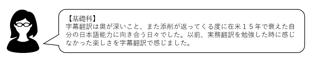 (ワイズスタッフ)実際に課題をやってみると、字数制限に収める難しさや字幕の翻訳の奥深さを実感しますよね。基礎科で学んだことをしっかり定着させて、次のコースでも頑張ってください!