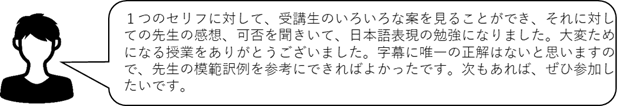 (ワイズスタッフ)皆さんが熱心に課題に取り組まれていたのがとても印象的でした。他の受講生の字幕から学んだり、先生からの細かいアドバイスがあったりと内容の濃い授業だったと思います。これからも頑張ってください!