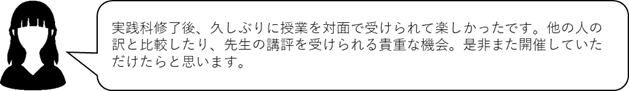 (ワイズスタッフ)他の受講生の翻訳を見ることで一人では気づけなかったことに気づき、良い勉強になったのではないかと思います。現役の先生の経験談を聞けるのも貴重な体験ですね。これから皆さんがお仕事で活躍できるよう願っています。